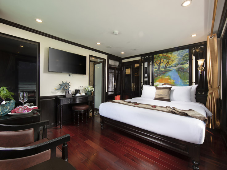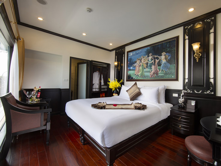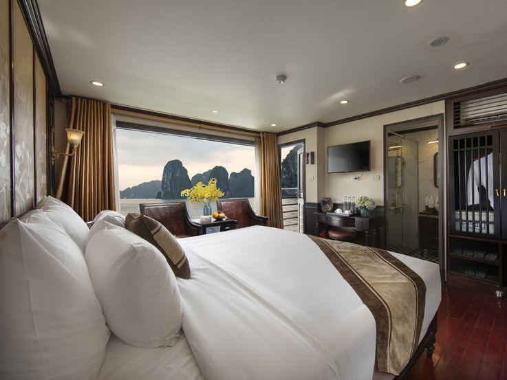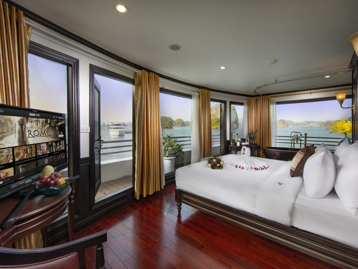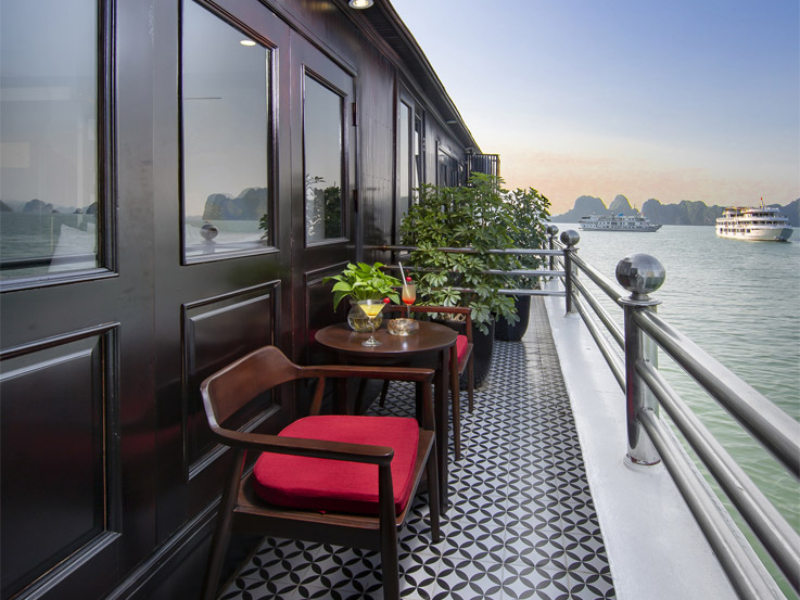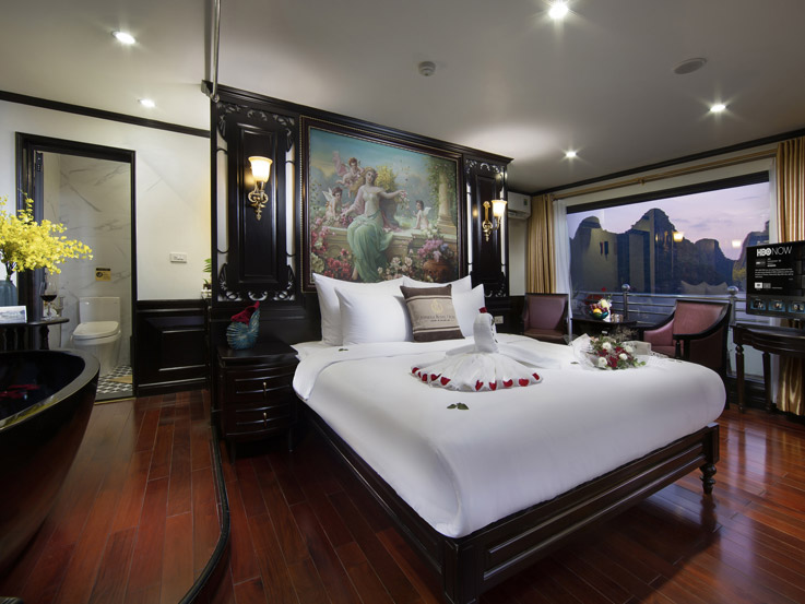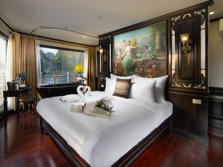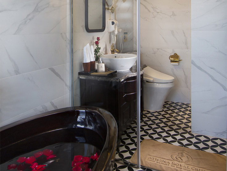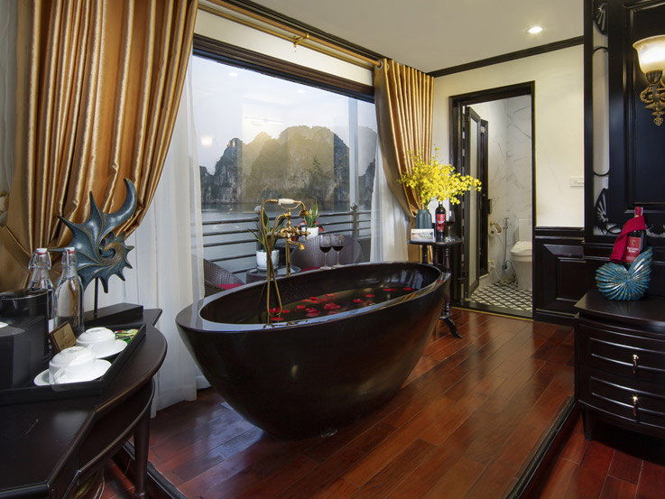 The most luxurious suite on board with a wooden bathtub, wide sea views, and elegant design. Includes a private balcony, fresh fruit, an extra child's bed, and a bottle of wine.
