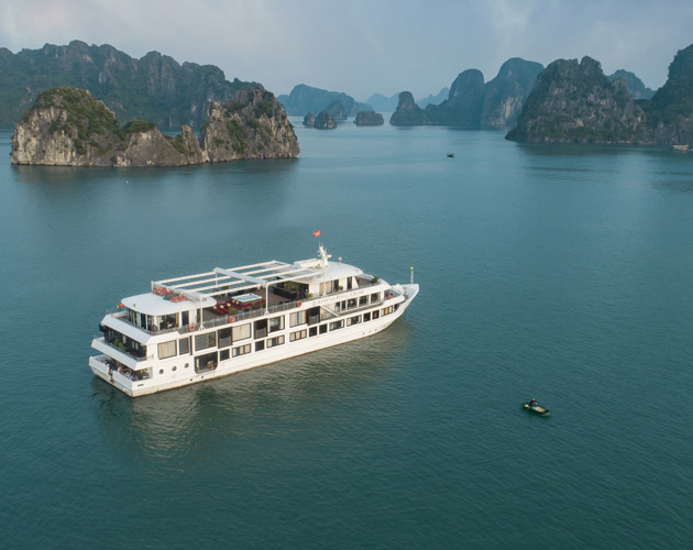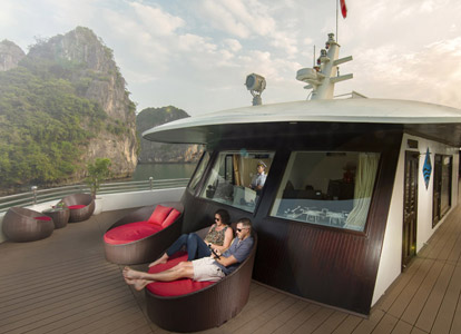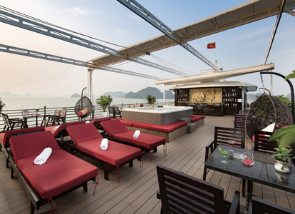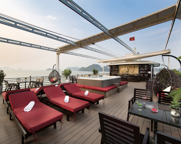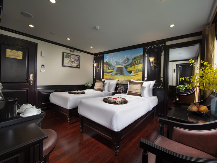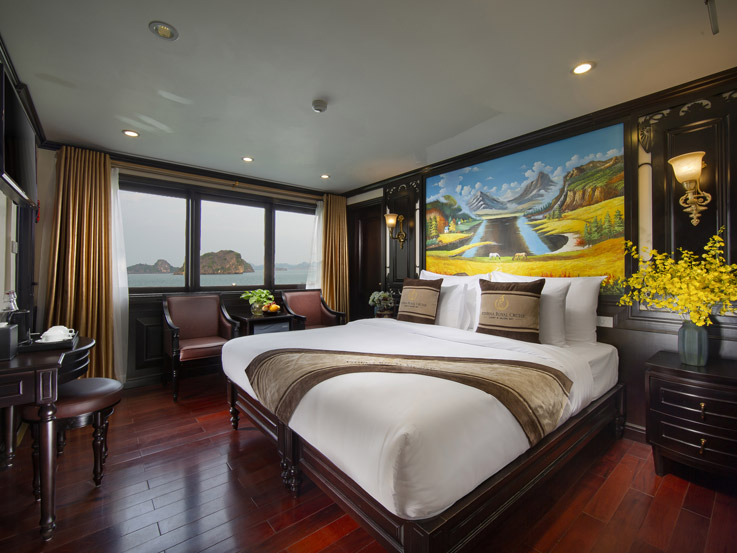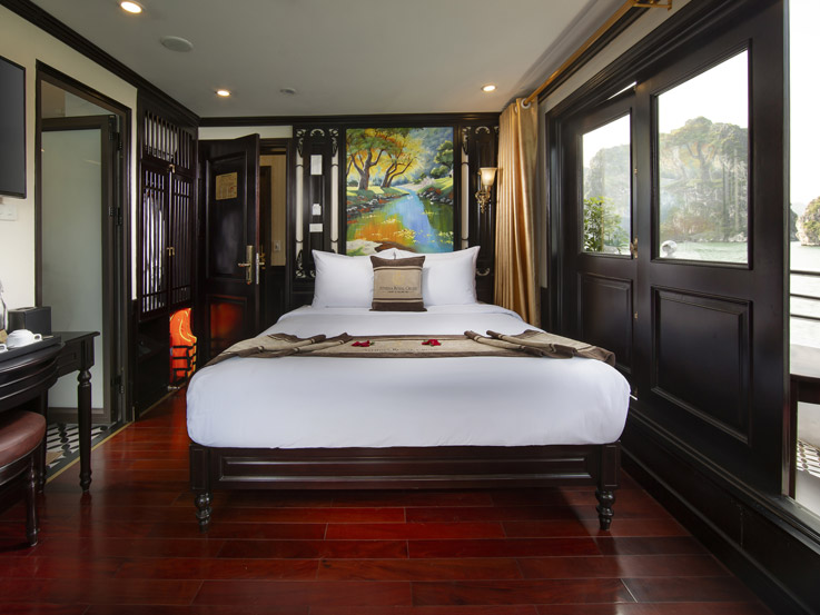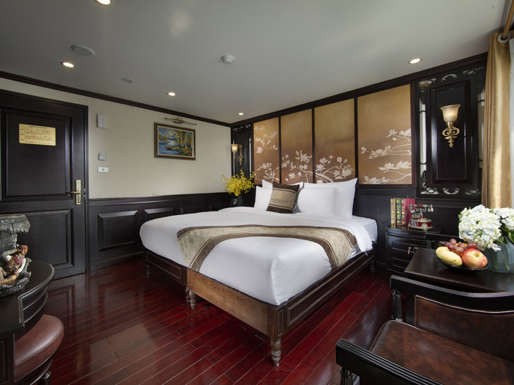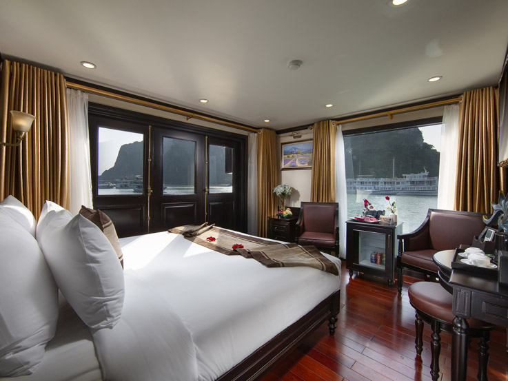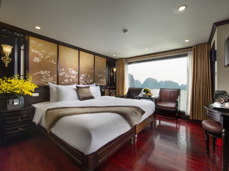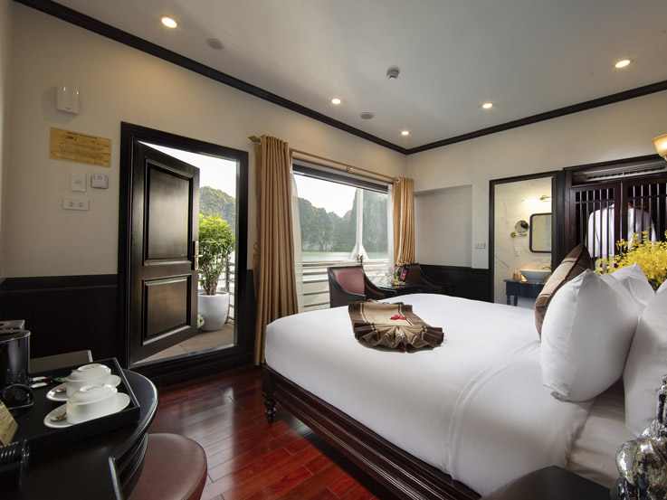 The most luxurious suite on board with a wooden bathtub, wide sea views, and elegant design. Includes a private balcony, fresh fruit, an extra child's bed, and a bottle of wine.