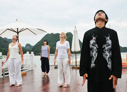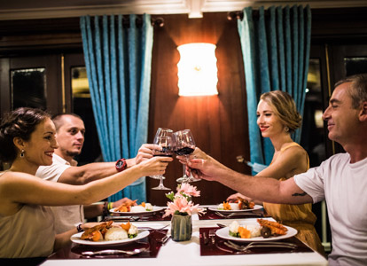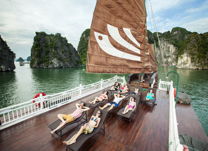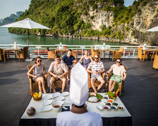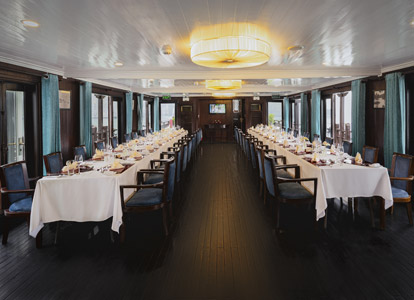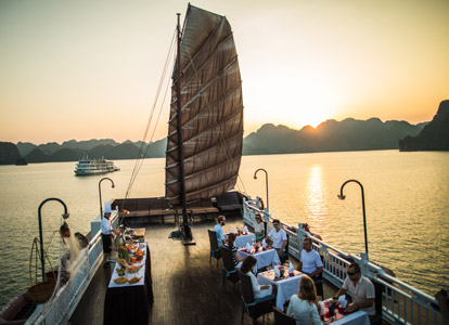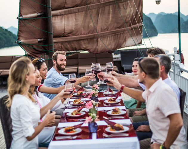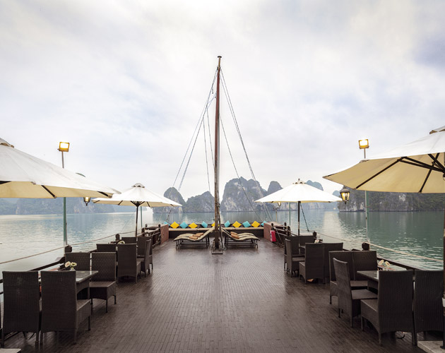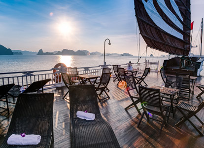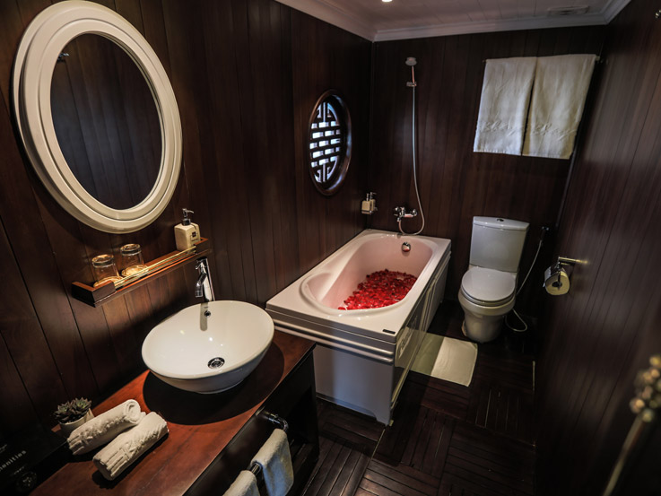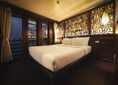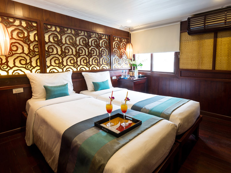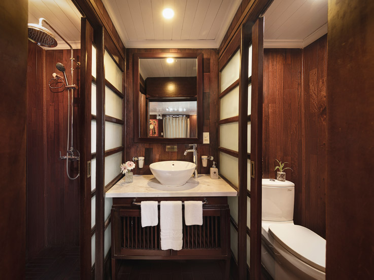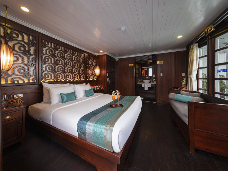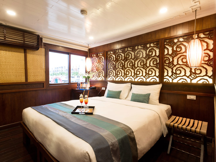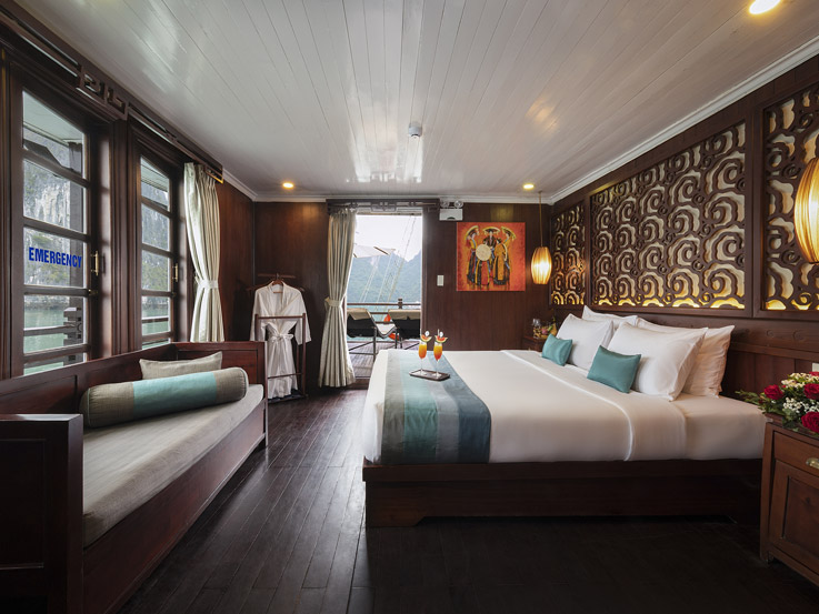 The Terrace Suite is the most exclusive and spacious accommodation on Bhaya Classic. Located on the upper deck, each suite boasts a private balcony where guests can relax in total privacy while enjoying uninterrupted views of Halong Bay’s dramatic limestone formations. The interiors are adorned with elegant wooden details, combining traditional Vietnamese aesthetics with a refined modern touch. With ample space, upgraded amenities, and a romantic setting, the Terrace Suite is an ideal choice for honeymooners, special occasions, or anyone seeking a truly indulgent Halong Bay overnight cruise.