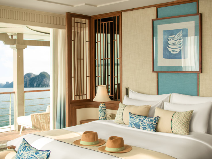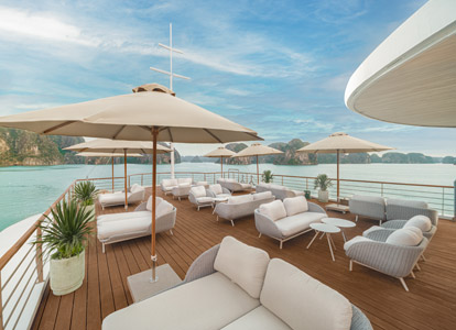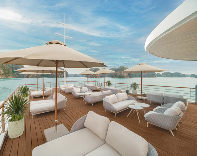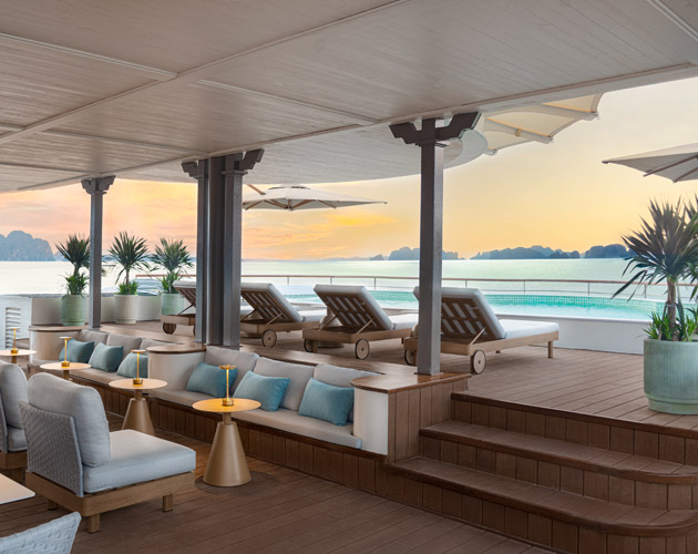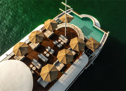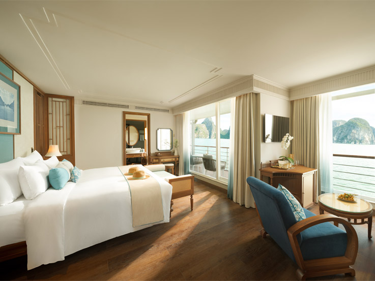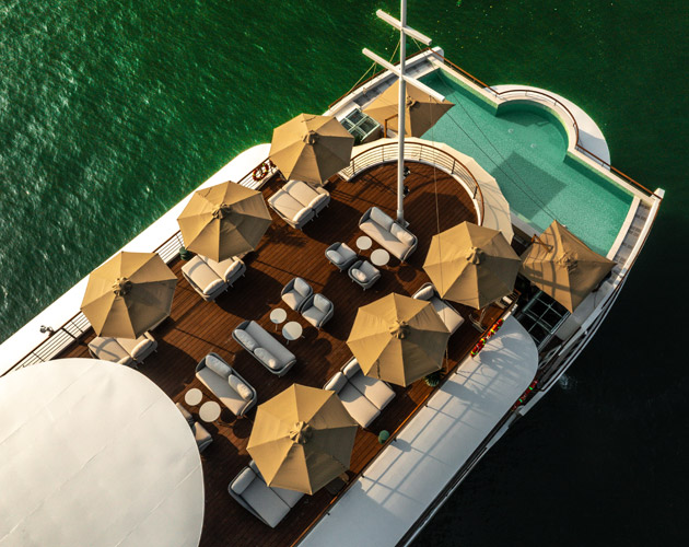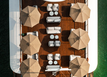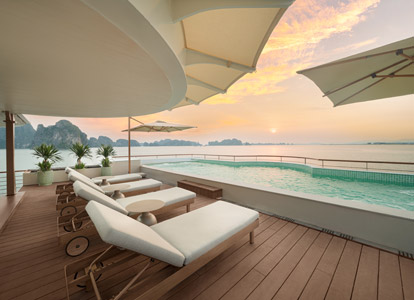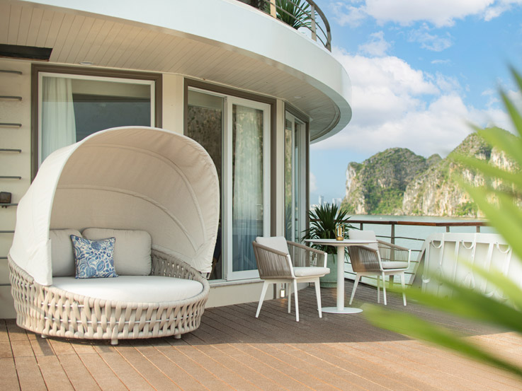 Signature Cabins are designed with the theme Nature’s Symphony, offering a calm and relaxing space. Each cabin has a private terrace with sun loungers, an ensuite bathroom with a bathtub, and modern amenities like a minibar, Wi-Fi, and a flat-screen TV.