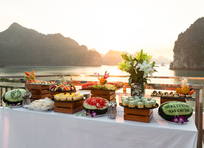 16:30: Take part in the Sunset Party & Happy Hour. Relax in this Lan Ha Bay Luxury Cruise with tea, coffee, and light snacks while watching the sunset over the bay. Happy Hour (Buy 2 Get 1 Free) runs from 16:00 to 17:15 and applies to selected cocktails, mocktails, and mixed drinks. The atmosphere is enhanced by traditional bamboo flute music and an engaging bamboo dance performance that showcases Vietnamese culture.