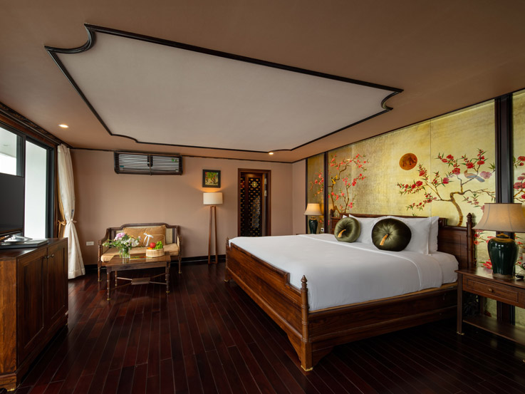 The crown jewel of the ship, this suite is a spacious and stylish suite with panoramic views and a large balcony, like a private boutique apartment. With top-notch amenities and elegant Indochine colonial accents, you will have an opportunity like royalty above Lan Ha’s karsts.