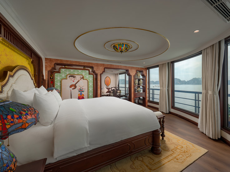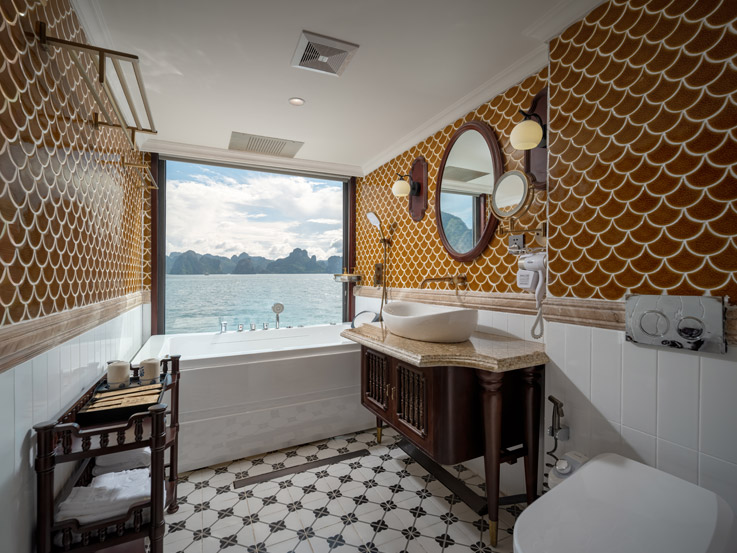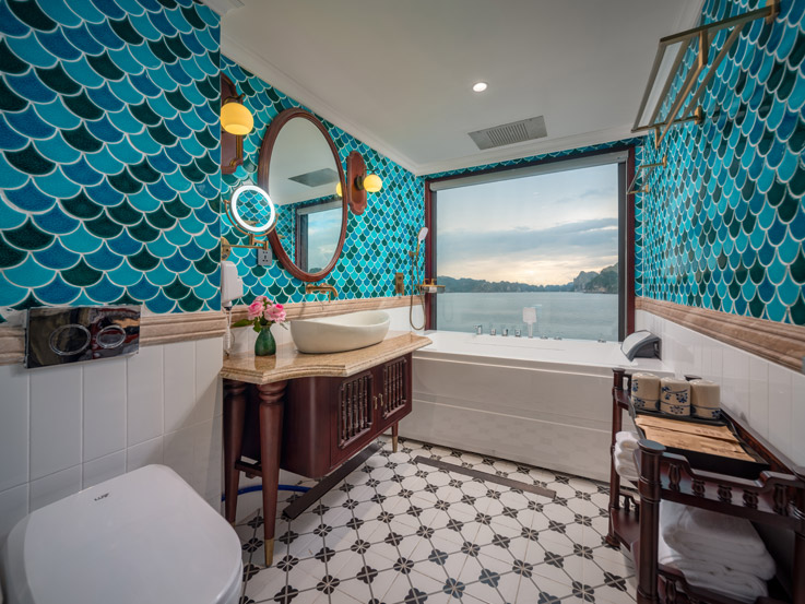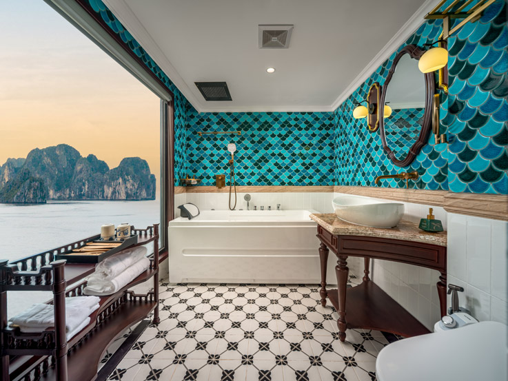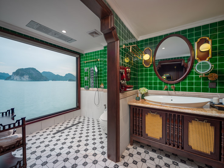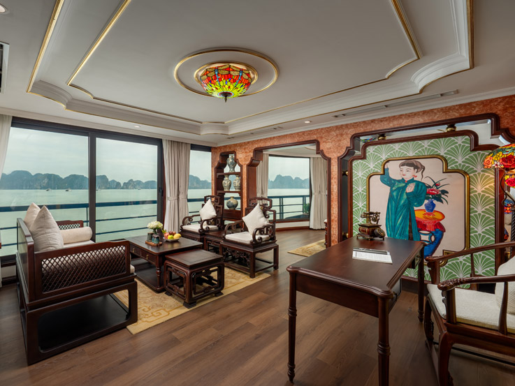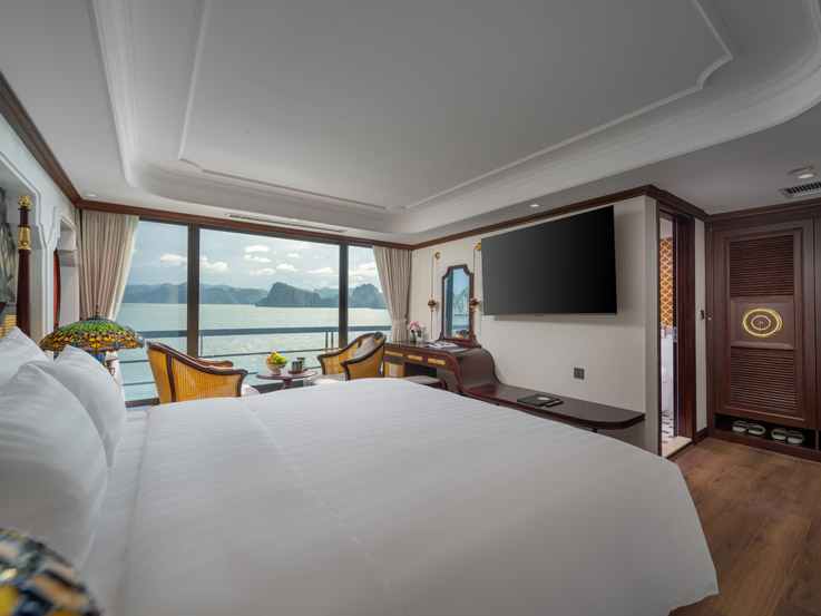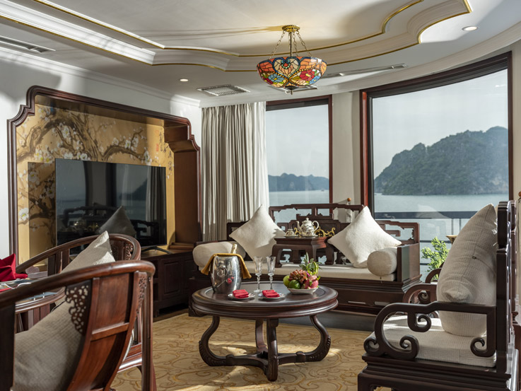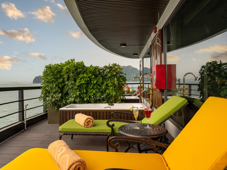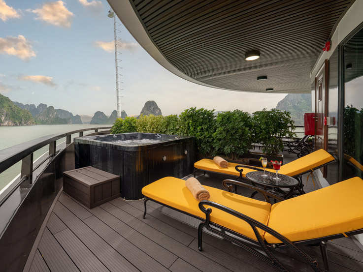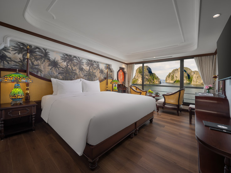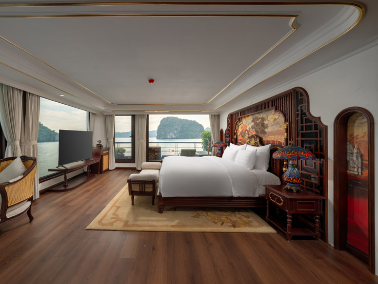 Oriental Cabin has a panoramic view of the beautiful bay through the large sliding glass door system. With an area of 30m², the room has a sophisticated Asian style and is equipped with a luxurious jacuzzi bathtub, allowing you to enjoy privacy and relaxation amidst the majestic nature of Halong Bay.