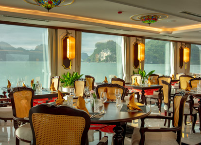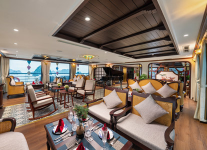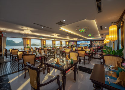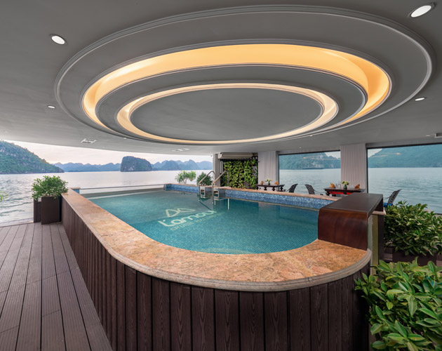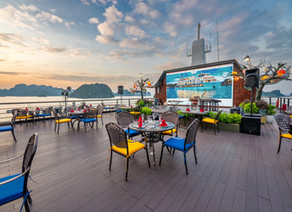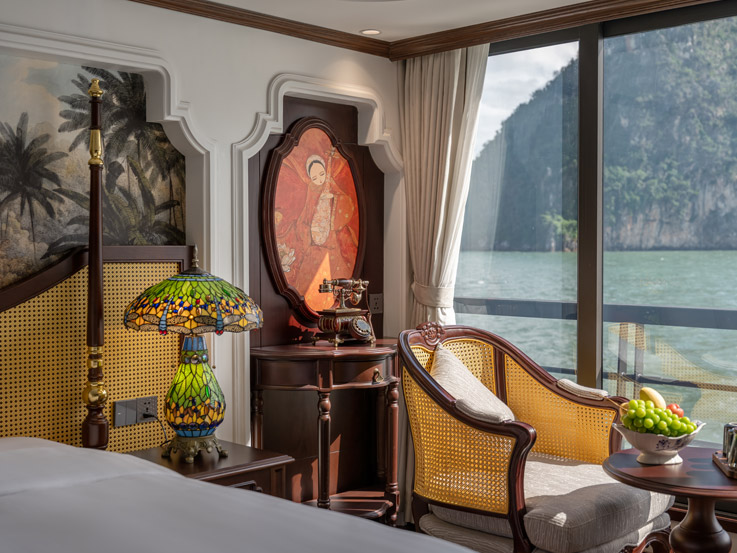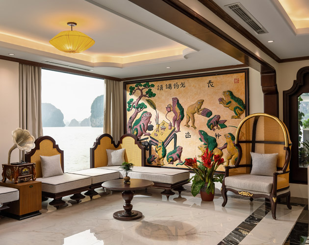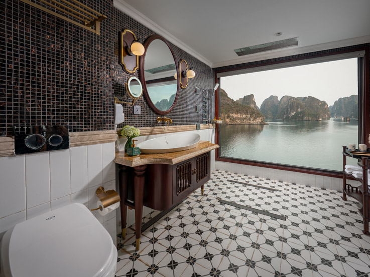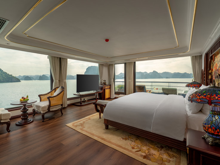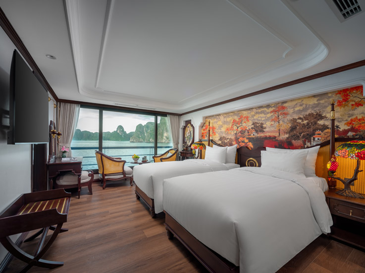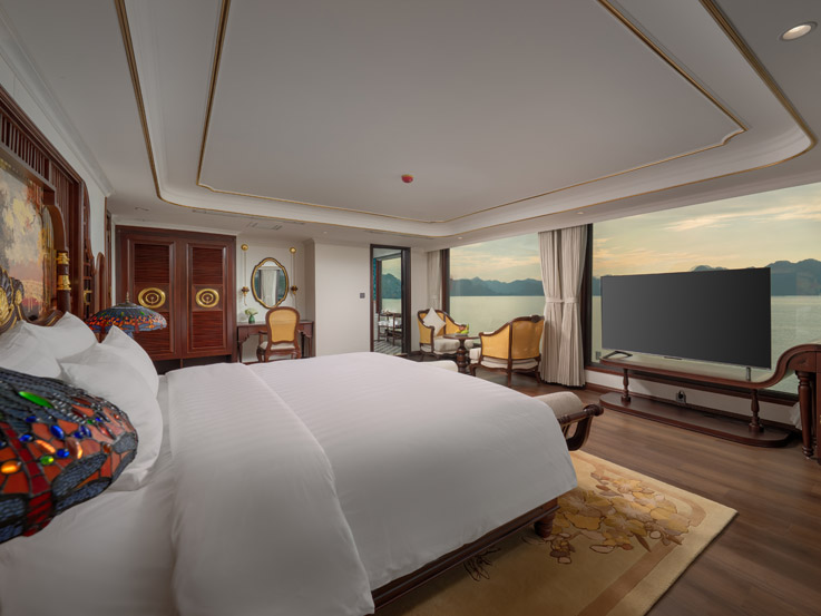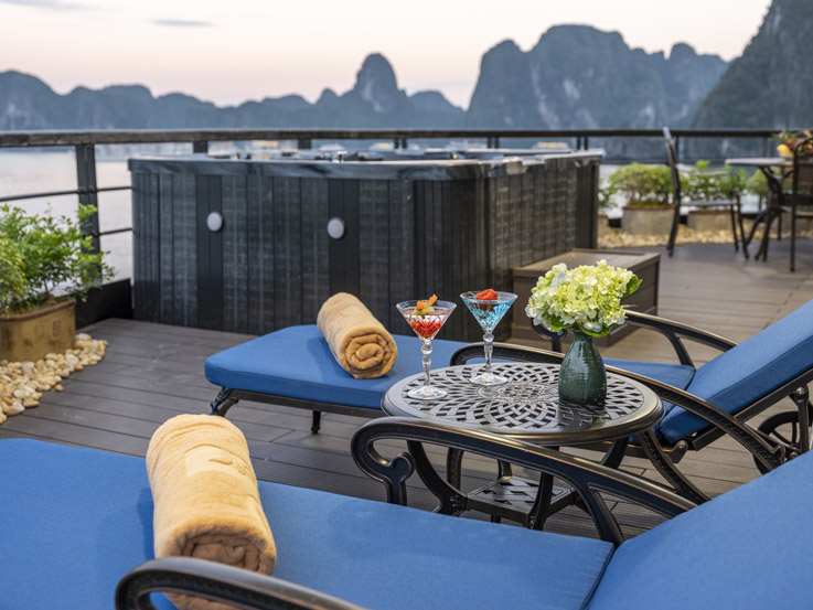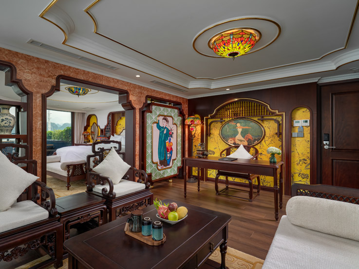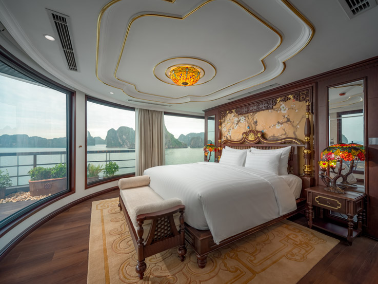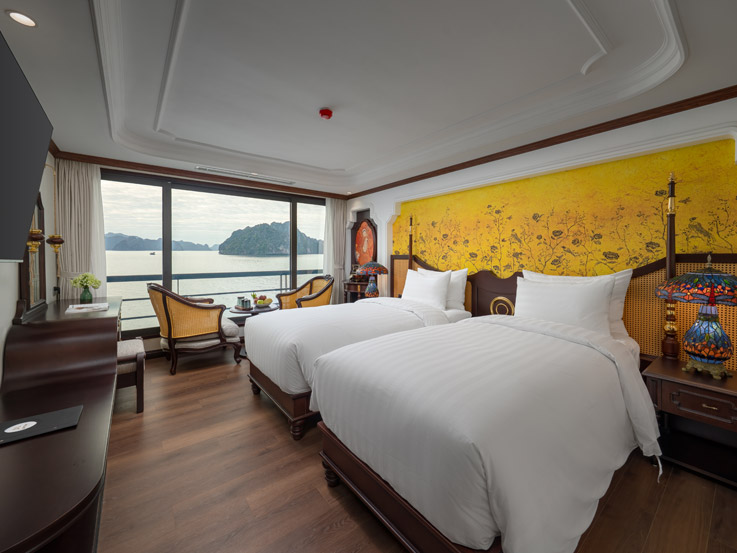 Oriental Cabin has a panoramic view of the beautiful bay through the large sliding glass door system. With an area of 30m², the room has a sophisticated Asian style and is equipped with a luxurious jacuzzi bathtub, allowing you to enjoy privacy and relaxation amidst the majestic nature of Halong Bay.
