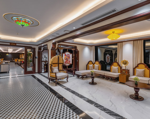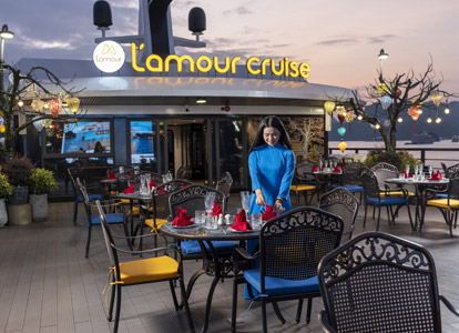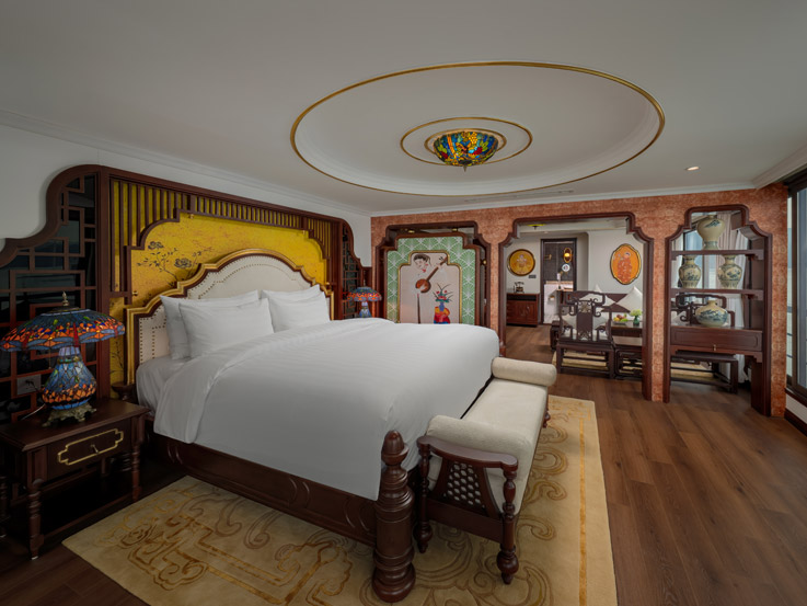 The Royal Palace Suite is the most luxurious room on the L’Amour cruise ship, located on the 3rd floor with an area of up to 75m². The room is designed like a miniature palace with a large private balcony, bathtub, and standing shower, outdoor jacuzzi, Himalayan salt sauna, and a series of luxury amenities. This is an ideal choice for honeymooners, anniversaries like a palace.