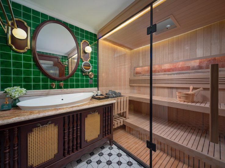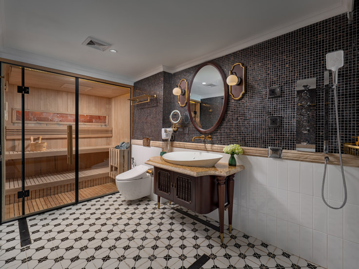 With an area of up to 70m², the Majestic Suite is a private paradise for those who love elegance and comfort. The room has a separate bathtub and shower, an outdoor jacuzzi, and a Himalayan salt sauna. The spacious private balcony brings an airy feeling amidst the poetic bay view.