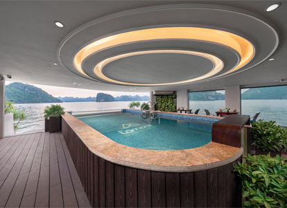 Century Cabin is good for travelers who want to enjoy a comfortable vacation in the middle of Halong Bay. With an area of 26m² and a variety of bed options, the room is suitable for couples, friends, or small families. All rooms have sea views, are equipped with jacuzzi bathtubs, Himalayan salt saunas, and modern design for maximum relaxation.
