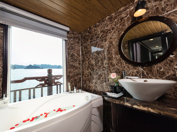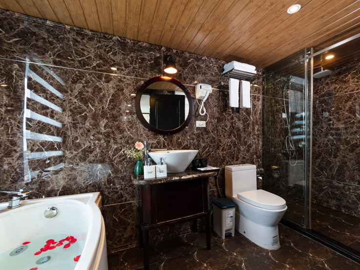 As the most prestigious accommodation on the cruise, the Amanda Royal Suite offers an expansive 60 m2, including a dedicated reading room. Situated on the 1st deck, the Amanda Royal Suite provides elevated views of Halong Bay’s limestone peaks. This suite provides a supreme level of privacy and luxury with its own large balcony and full bathtub facilities.
