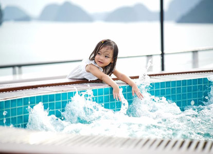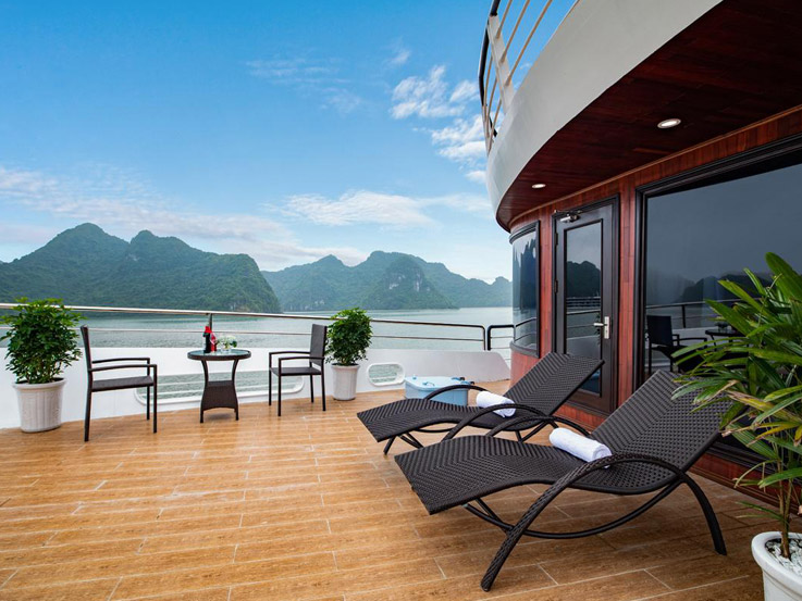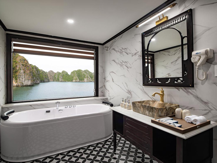 A premium retreat featuring a private sun terrace and a luxurious bathtub for ultimate relaxation. The expansive glass windows invite natural light and uninterrupted panoramic views into the room. Perfect for families or guests looking for an exclusive and indulgent cruising experience.