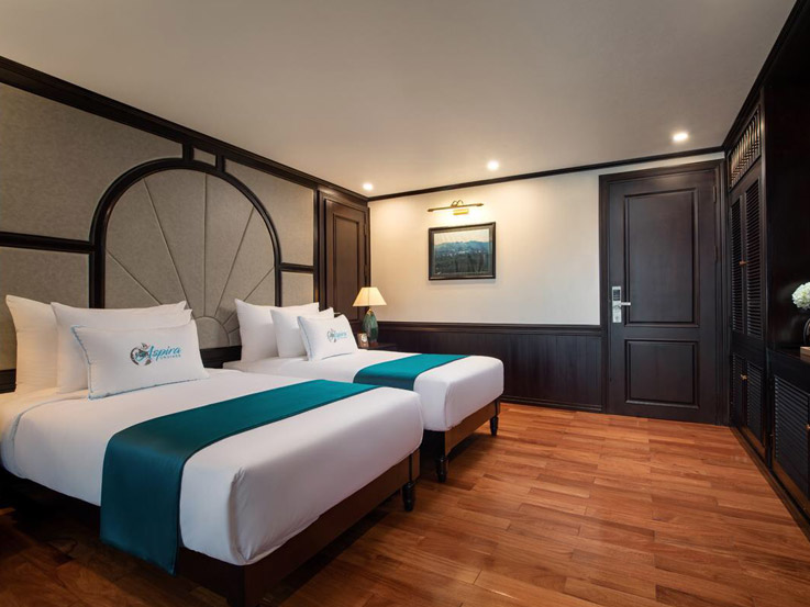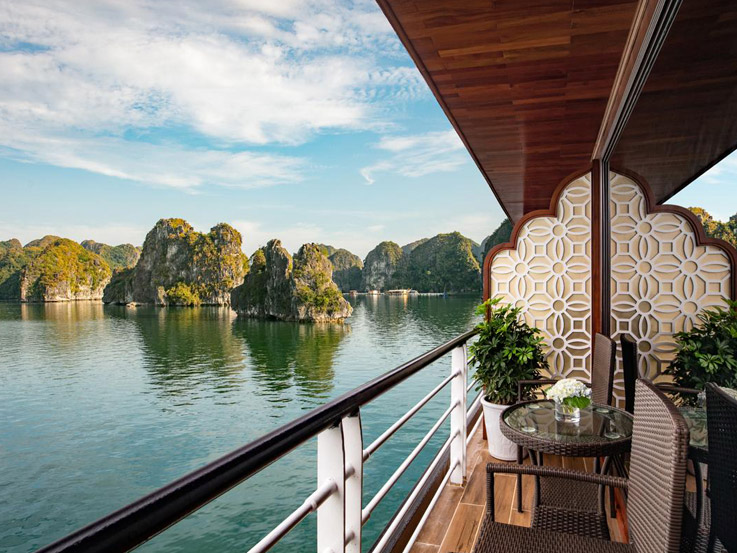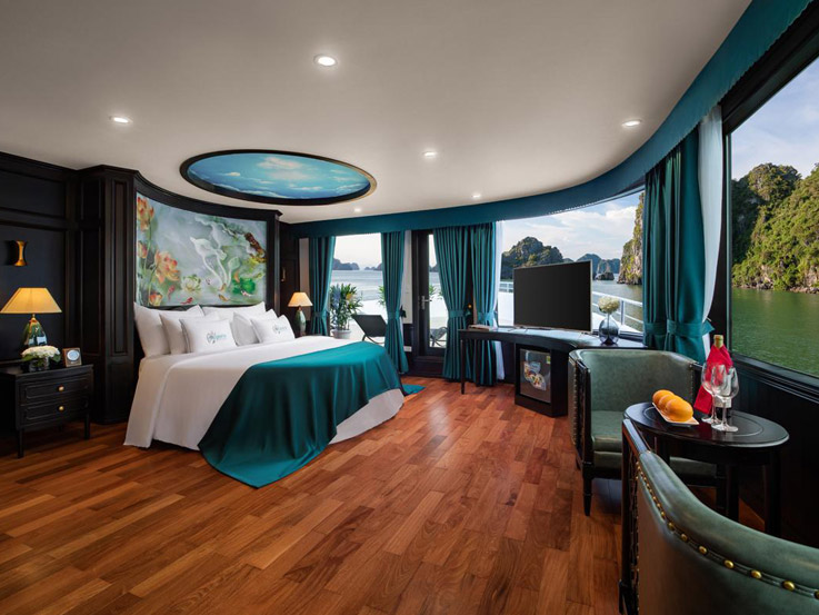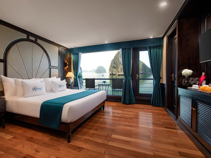 The Junior Suite with Private Balcony is located on the 1st floor, offering a cozy yet elegant space with panoramic ocean views. Each cabin features a private balcony, allowing guests to enjoy the breathtaking scenery fully. With flexible bedding options, it is ideal for couples, families, or small groups seeking comfort and relaxation.