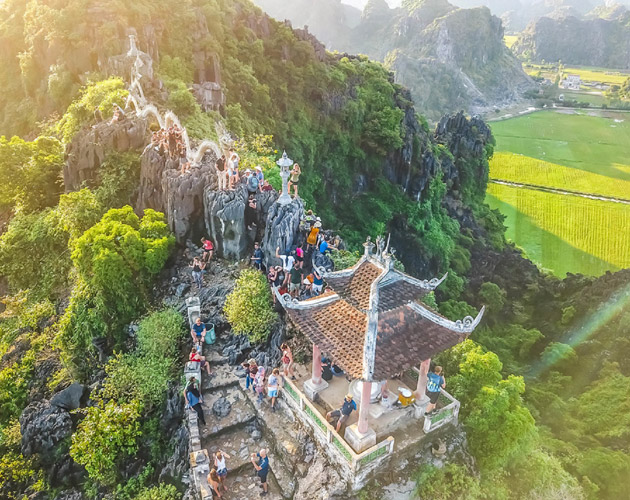16:00: Board the limousine bus for the short transfer to Mua Cave — Dragon Peak. Lace up your shoes and begin the ascent: approximately 500 stone steps carved into the mountainside, each switchback revealing a wider and more spectacular view. At the summit of Lying Dragon Mountain, the full panorama of Ninh Binh's karst landscape unfolds below: rivers, cave entrances, rice fields, and the karst peaks you glided through at Trang An. In summer, the lotus gardens blooming at the mountain's base add extraordinary colour to an already unforgettable scene. Take your time — this moment deserves it.