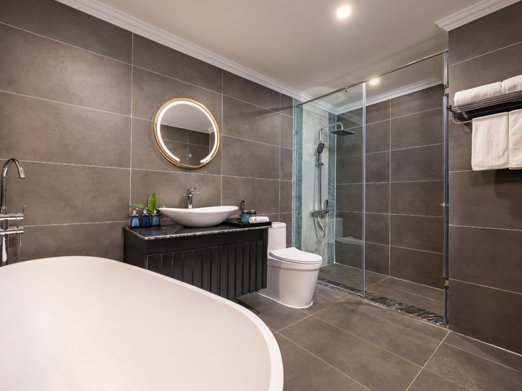 Designed for small groups or families, the Triple Suite offers ample space with a combination of one double bed and one single bed. Guests can enjoy the scenic views of Lan Ha Bay from the private balcony and unwind in the ocean-view bathtub.
