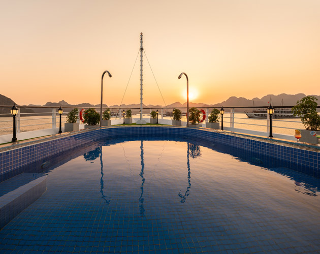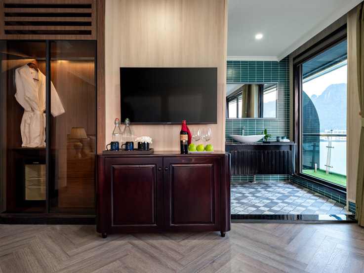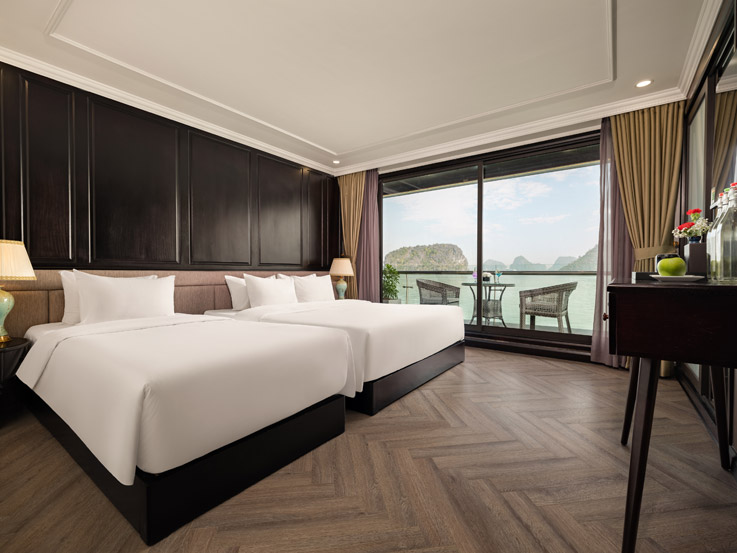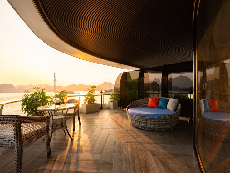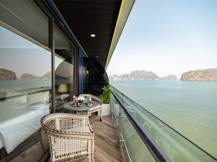 Tailored for couples seeking a romantic escape, the Honeymoon Suite boasts elegant furnishings and a spacious layout. Located on the upper decks, it offers stunning views of Lan Ha Bay through panoramic windows and a large terrace, creating an intimate and memorable experience.