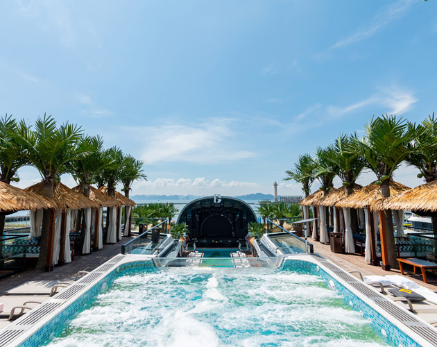 One of the coolest spots on the cruise is the huge four-season swimming pool on the Upper Deck – the largest you’ll find on any ship in Vietnam. It stretches 33 meters long, giving you plenty of space to swim, relax, or just float around. Double sunbeds and palm-lined views make it feel like a seaside resort. With clear glass-bottom areas and stunning bay scenery all around, every moment here feels refreshing and unforgettable.