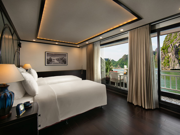 The Junior Suite on Hermes Cruise is located on the 1st floor and features one of six exclusive cabins designed for two adults. With a room size of 28m² and a 7m² balcony, the suite offers either a double or twin bed, ensuring a comfortable and relaxing stay while you explore the beauty of Halong Bay.