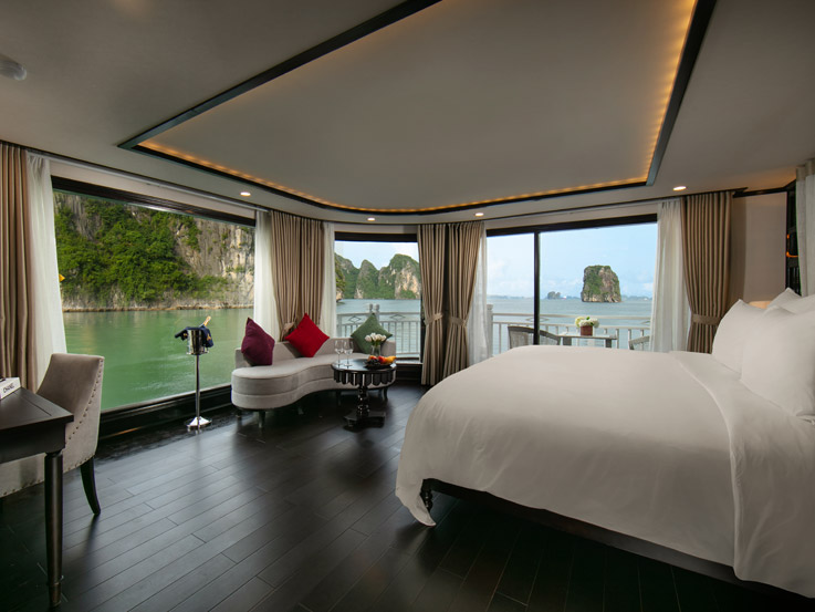 The President Suite on Hermes Cruise offers a luxurious 64m² space on the second floor, featuring a unique round bed and a private balcony. Guests can enjoy panoramic ocean views, an outdoor Jacuzzi, and a stylish interior designed for ultimate comfort and relaxation. This suite is perfect for couples seeking an exclusive and romantic experience while cruising through the stunning Halong Bay.