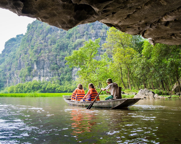 13:30: Board your traditional bamboo rowing boat for a 1.5-hour journey through Tam Coc — 'Halong Bay on Land.' The boat glides silently along a river flanked by towering limestone karst peaks, passing through the three famous natural cave tunnels: Hang Ca, Hang Hai, and Hang Ba. Inside each cave, stalactites hang above the waterline, and the sound of the oars echoes off ancient rock. Outside, emerald rice paddies and stone mountains reflect in the river's surface. It is one of the most photographed and most beloved landscapes in all of Vietnam — and in person, it exceeds every photograph.
