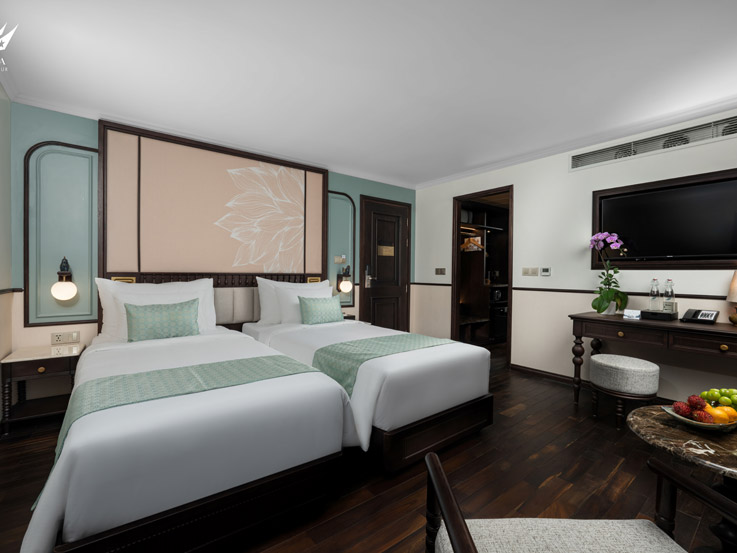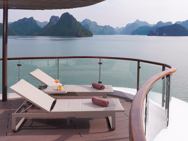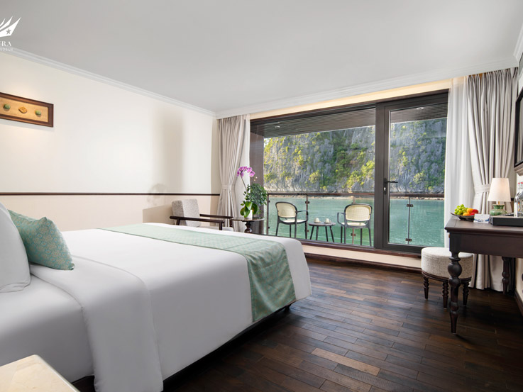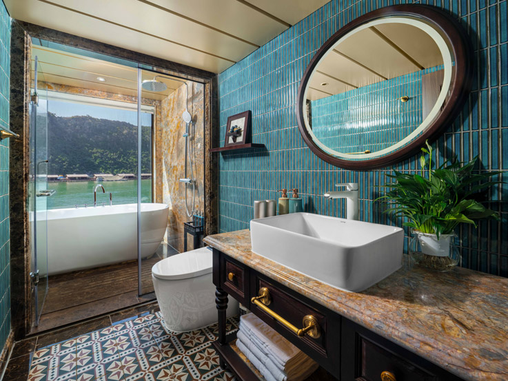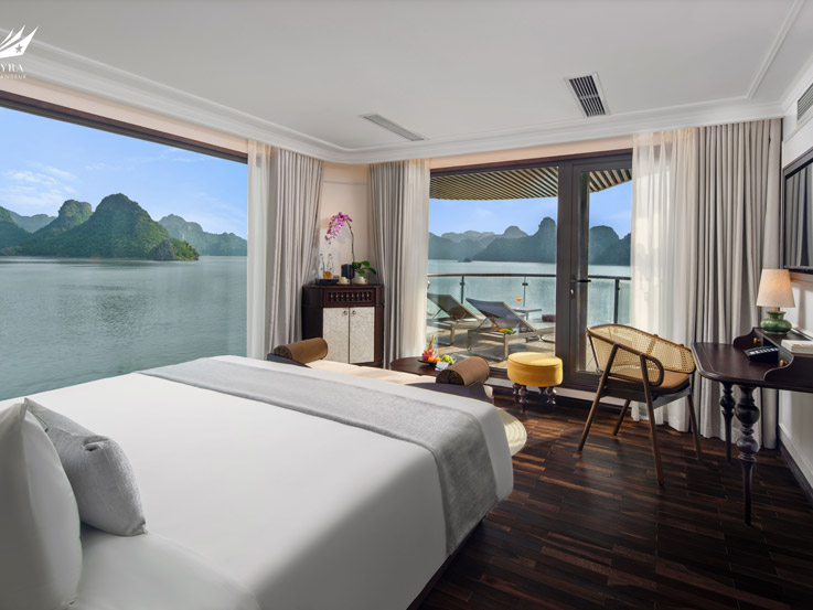 The Sky Suite offers panoramic bay views from the highest guest deck of the ship. With a large balcony and bathtub overlooking the ocean, this suite is an ideal romantic setting for couples. The interior combines classic charm with modern comfort, creating a warm and peaceful atmosphere where every detail contributes to a premium overnight experience in Halong Bay.