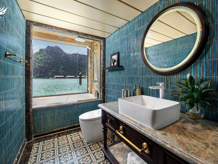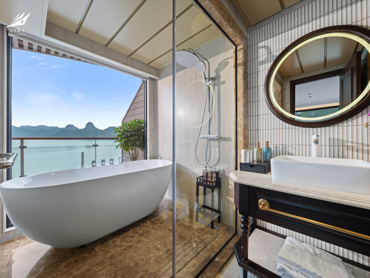As the most prestigious suite on the Lyra Grandeur Cruise, the Owner Suite is designed for those who seek absolute exclusivity. With a private sundeck, a steam bath, and an ocean-view jacuzzi tub, the Owner Suite offers complete privacy on the Lyra Grandeur Cruise. Spacious and elegantly decorated, this suite is perfect for honeymooners, VIP travelers, or anyone who wants the very best on their Halong Bay Cruise.