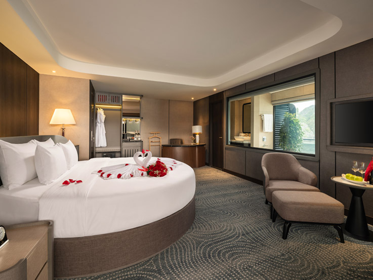 Designed for couples, this suite features large windows and a private balcony with seating. Guests can savor tea, breathe in the ocean breeze, and enjoy panoramic views of Lan Ha Bay in an intimate setting.