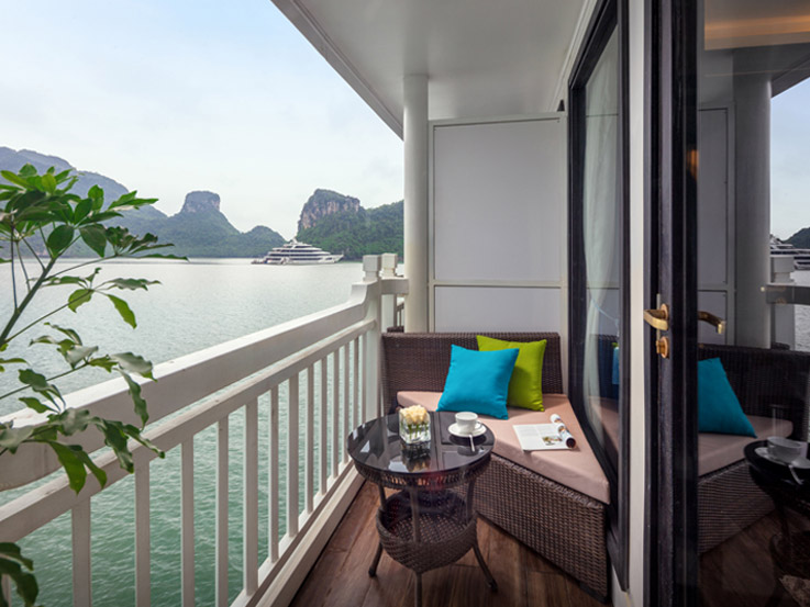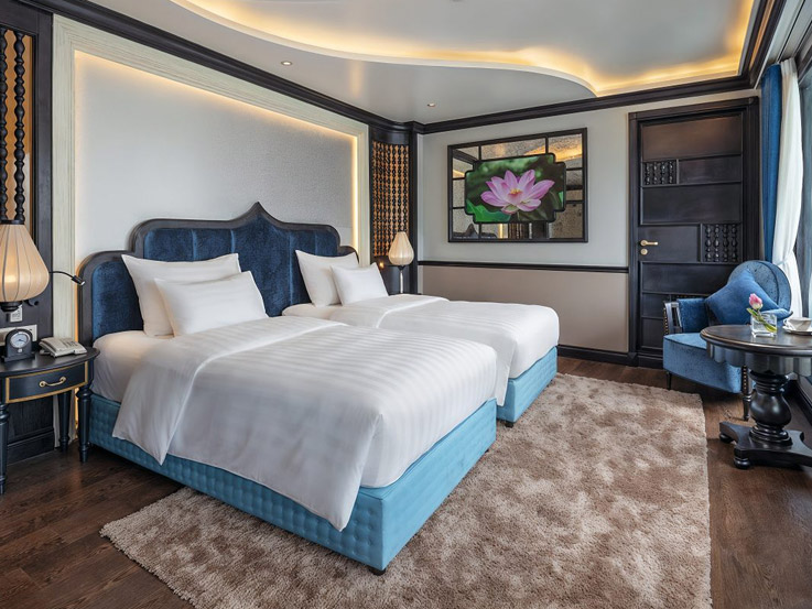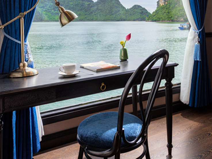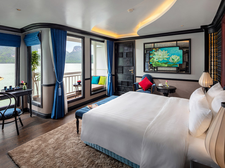 Located on the lower deck, the Deluxe Room offers an elegant design with modern comforts. Featuring large glass doors opening to a private balcony, it is a peaceful space to enjoy the view of the bay.