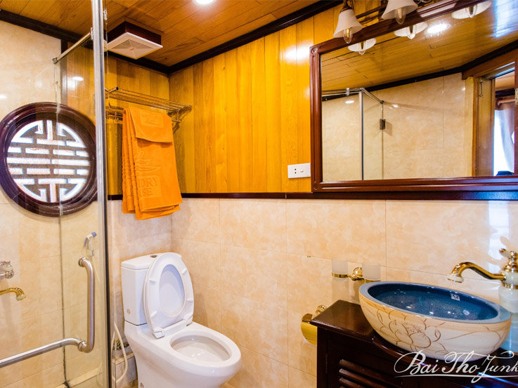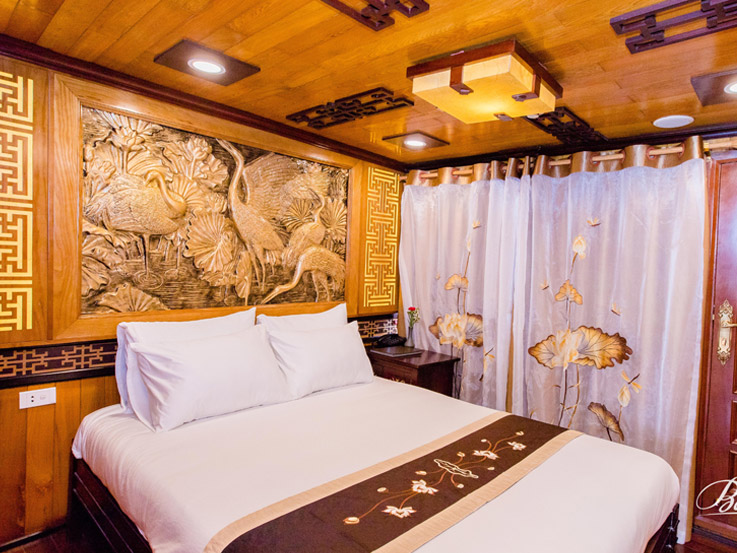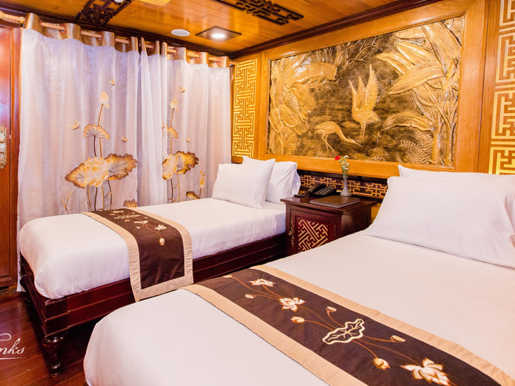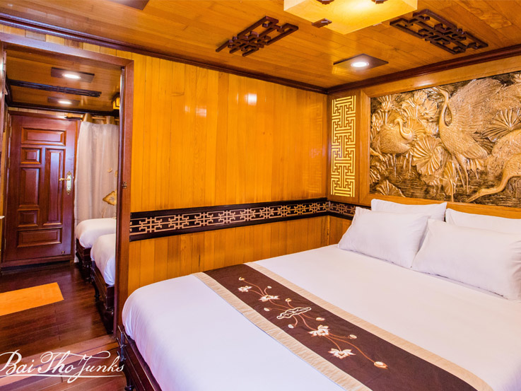 Located on the 1st and 2nd decks of the Victory Cruise, the Deluxe Cabin offers a cozy and comfortable retreat for couples or friends. With an average size of 16m², each room is thoughtfully designed with either a double or twin bed configuration to suit your needs. The elegant wooden interior reflects traditional Vietnamese aesthetics, creating a warm and relaxing atmosphere. Large windows provide natural light and partial views of the bay, making this cabin an ideal choice for travelers seeking both value and comfort.