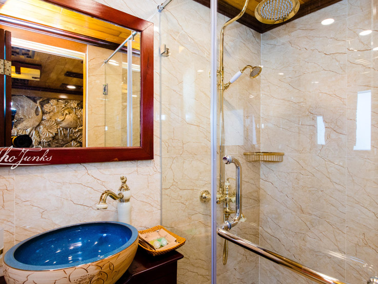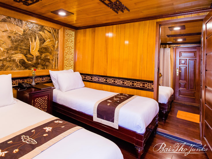 Perfect for small families, the Deluxe Family Cabin consists of two adjoining Deluxe Cabins, each 16m², offering a total of 32m² of shared space. Located on the 1st and 2nd decks of the Victory Cruise, the cabin is available with double or twin beds, comfortably accommodating 2 adults and 2 children. The connecting layout ensures privacy for parents while keeping children close by, making it a practical and cozy option for family getaways. The traditional wooden interiors and warm design offer a peaceful haven for the whole family after a day of exploring the bay.